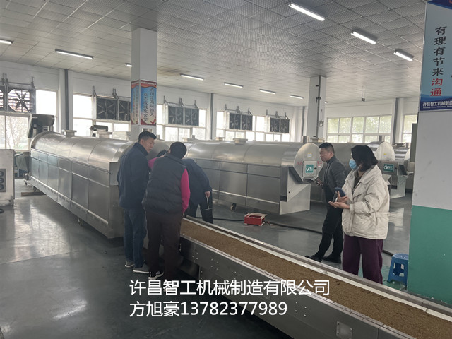 客户带来孜然和辣椒现场试机六米电磁流水线进行炒制,客户对电磁炒货机的产能和炒制效果非常满意。